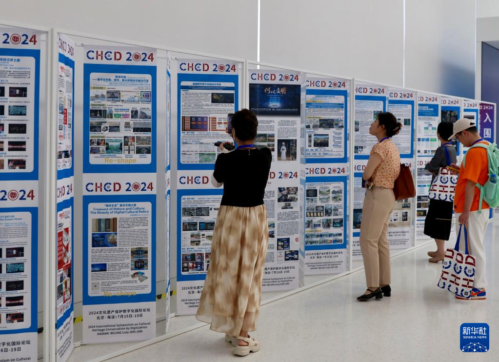7月16日,參觀者觀看論壇入圍海報(bào)展示墻,了解數(shù)字遺產(chǎn)實(shí)踐案例。新華社記者 方思賢 攝