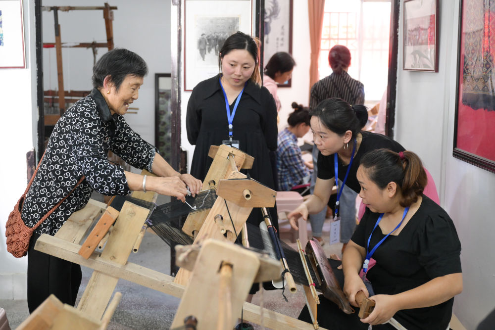 7月2日,湖北省來(lái)鳳縣桂花樹(shù)社區(qū),唐洪祥的老伴劉秀琴(左一)指導(dǎo)前來(lái)學(xué)藝的學(xué)員們操作織機(jī)。