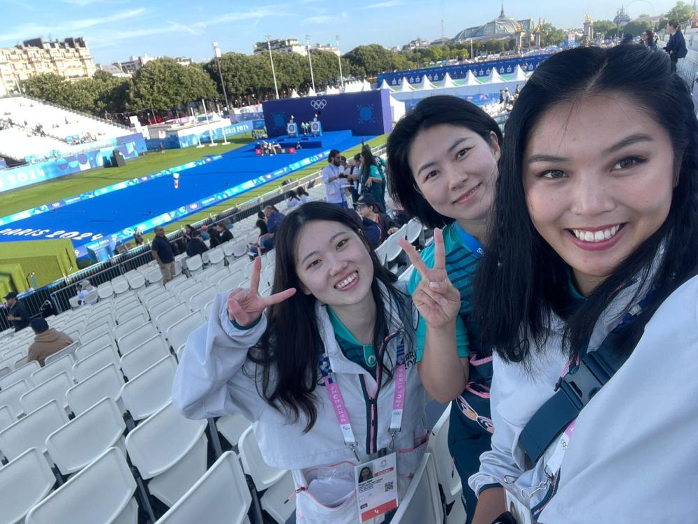 7月28日,中國(guó)志愿者任警怡(左一)和韓國(guó)志愿者(左二)、日本志愿者(右一)在巴黎奧運(yùn)會(huì)射箭項(xiàng)目場(chǎng)地。(受訪(fǎng)者供圖)