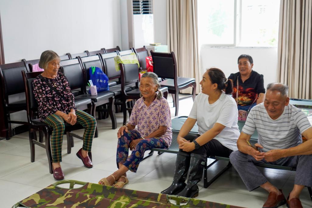 7月30日,富強(qiáng)村村委會(huì)辦公點(diǎn)內(nèi),村黨支部書(shū)記謝小紅(右二)和被安置的群眾聊天,了解他們的困難和需求。新華社記者 劉潺 攝