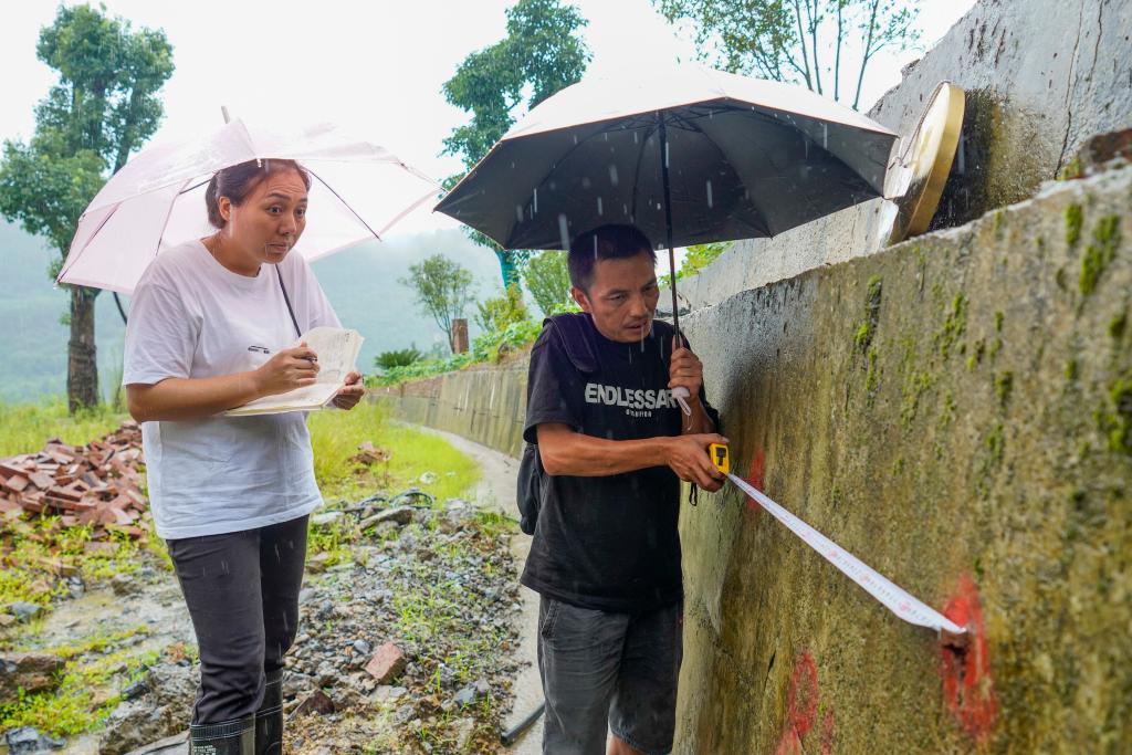 7月30日,富強(qiáng)村村黨支部書(shū)記謝小紅(左一)和地質(zhì)災(zāi)害監(jiān)測(cè)員魯業(yè)江(右一)一起對(duì)富強(qiáng)村一處地質(zhì)災(zāi)害點(diǎn)進(jìn)行測(cè)量和監(jiān)測(cè)。新華社記者 劉潺 攝