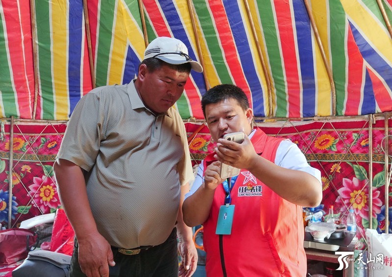 工作人員給牧民木拉提·畢木拉介紹用手機連接“智慧項圈”后的使用方法。周偉杰 攝