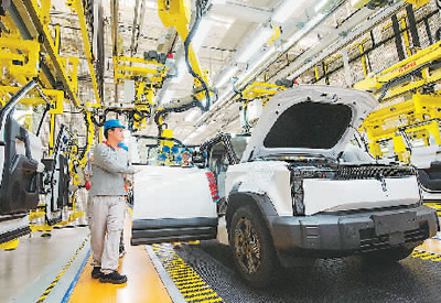 今年上半年,安徽省蕪湖市出口電動(dòng)載人汽車數(shù)量1.49萬(wàn)輛,同比增長(zhǎng)144.3%。圖為在蕪湖市奇瑞新能源愛(ài)咖生態(tài)科技有限公司新能源汽車生產(chǎn)車間,工人在進(jìn)行組裝生產(chǎn)作業(yè)。