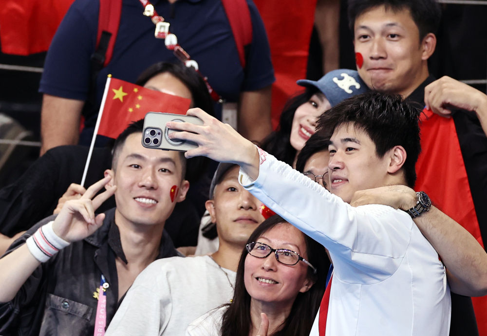 ↑中國(guó)選手潘展樂(lè)(右一)在頒獎(jiǎng)儀式后與觀眾合影。新華社記者 雒圓 攝