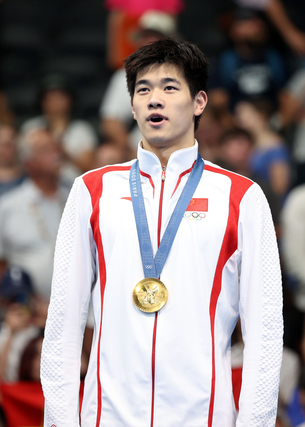 ↑中國(guó)選手潘展樂(lè)在頒獎(jiǎng)儀式上。新華社記者 杜宇 攝