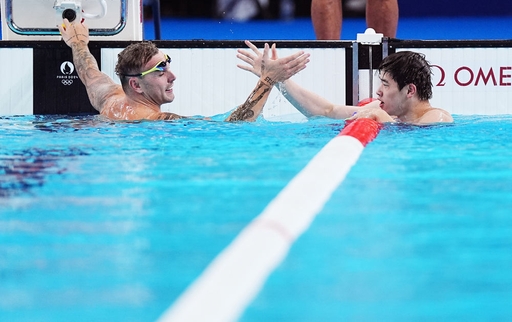 ↑中國(guó)選手潘展樂(lè)(右)與亞軍澳大利亞選手查默斯在比賽后慶祝。