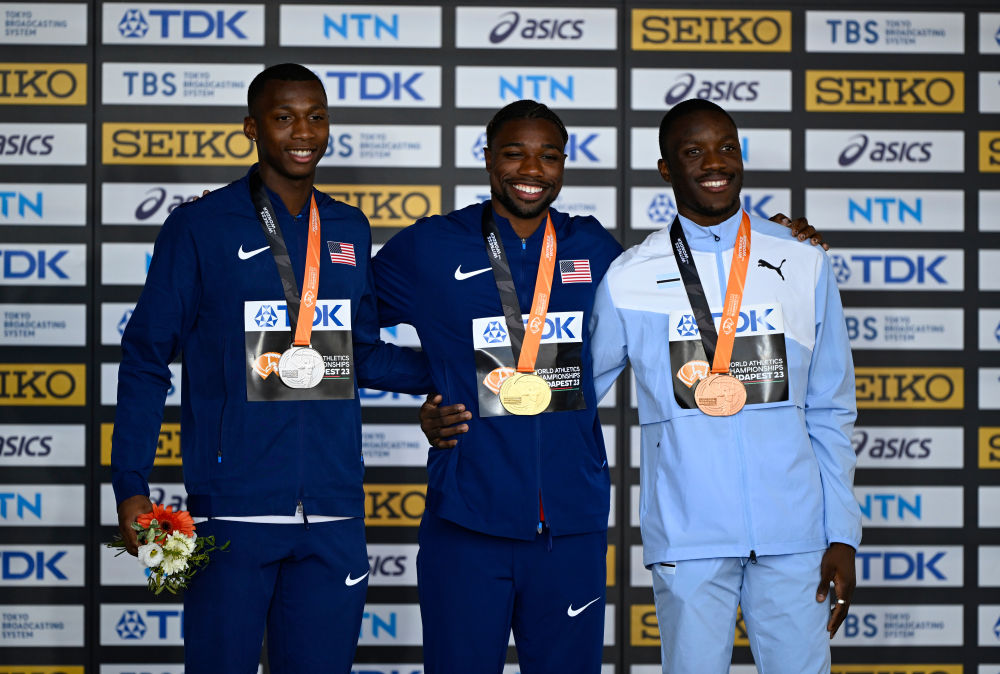 埃里揚(yáng)·奈頓(左)在2023年田徑世錦賽中獲得男子200米亞軍。新華社記者 宋彥樺 攝
