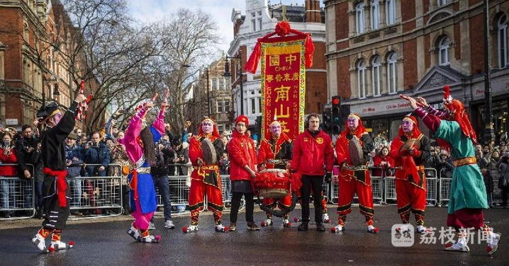當?shù)貢r間 2024 年 2 月 11 日,陳來發(fā)教練率領廣東普寧南山英歌隊的近 20 名舞者現(xiàn)身英國倫敦,揭開了當?shù)匦麓簯c典的帷幕,這也是普寧英歌首次出海。與此同時,千里之外的普寧市內另有一支南山英歌隊伍正穿梭于街巷,為市民驅邪扶正,帶隊者之一正是陳揚波。
