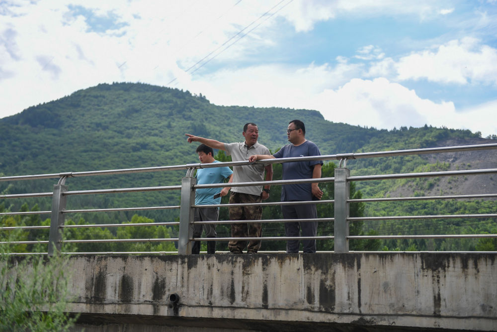 7月31日,在臨城村,金勇誠(chéng)(右二)帶領(lǐng)臨江市水利局的專(zhuān)家查看受損的供水管道。新華社記者 張楠 攝