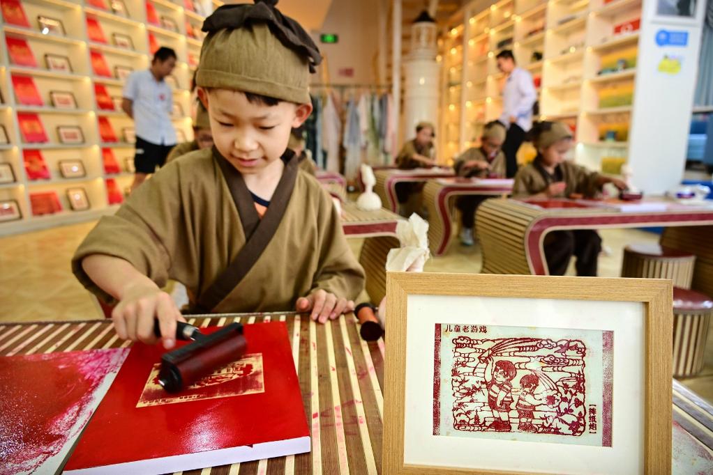 暑假期間,位于青島棧橋書店的印象國風藝術(shù)館舉行拓印研學活動,吸引學生前來學習、體驗。新華社記者 李紫恒 攝