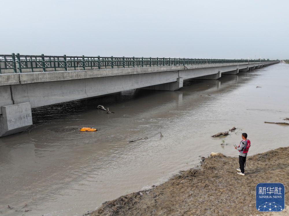↑在新疆阿克蘇地區(qū)沙雅縣蓋孜庫(kù)木鄉(xiāng),阿克蘇水文勘測(cè)局的工作人員在蓋孜庫(kù)木大橋防洪段收集水文信息(8月3日攝)。