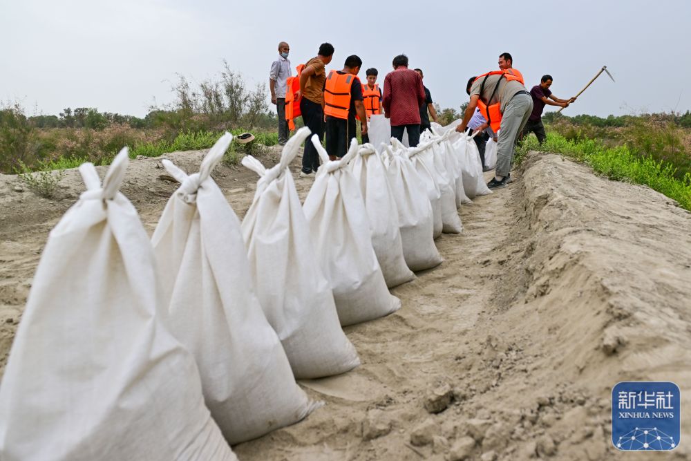 ↑在新疆阿克蘇地區(qū)沙雅縣蓋孜庫(kù)木鄉(xiāng)一處河堤除險(xiǎn)加固現(xiàn)場(chǎng),搶險(xiǎn)人員在裝運(yùn)沙袋(8月3日攝)。