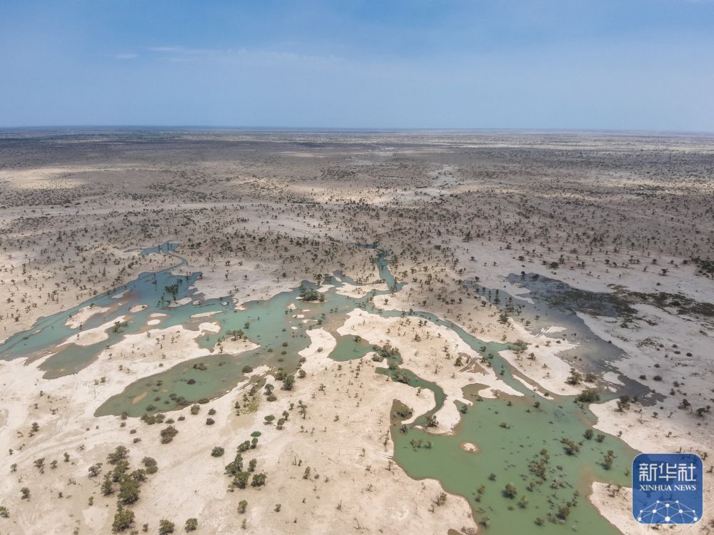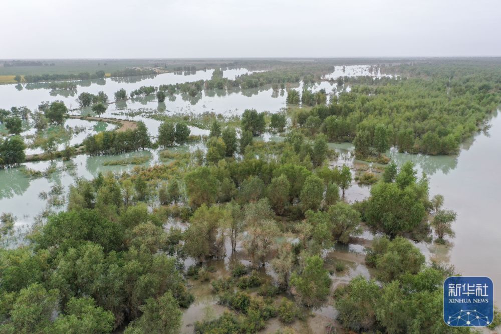 ↑8月1日拍攝的利用塔里木河洪水灌溉阿克蘇地區(qū)沙雅縣天然胡楊林的場(chǎng)景(無(wú)人機(jī)照片)。