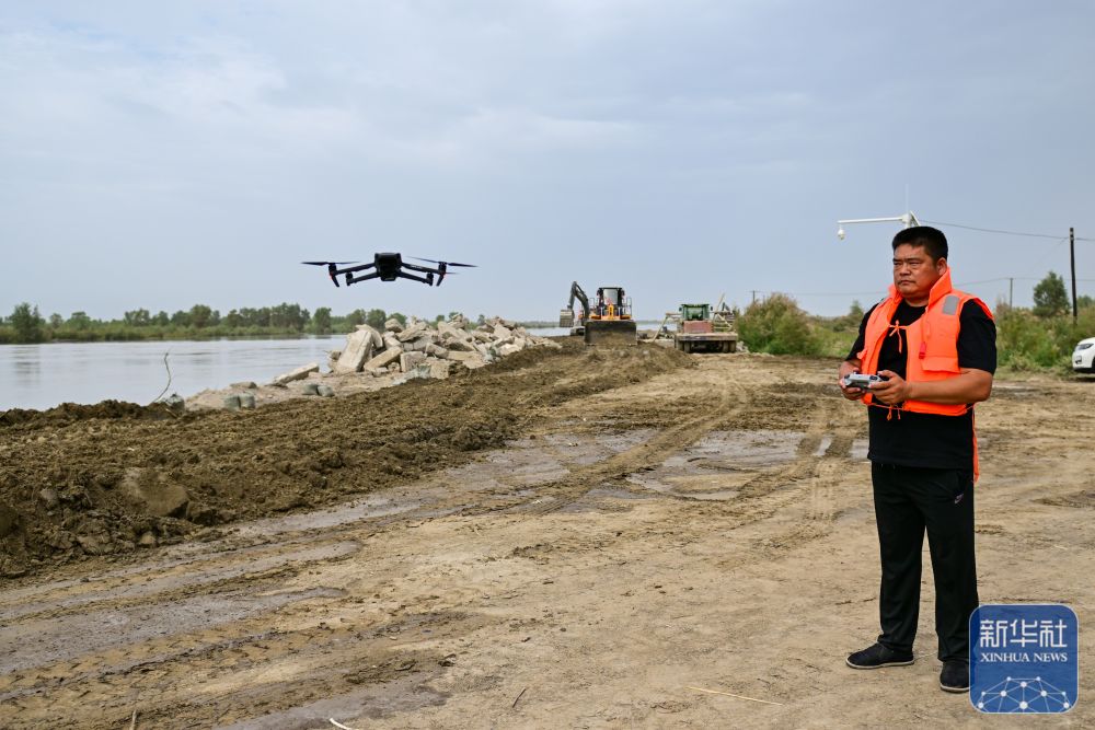 ↑在新疆阿克蘇地區(qū)沙雅縣蓋孜庫(kù)木鄉(xiāng)吐央村,搶險(xiǎn)人員利用無(wú)人機(jī)進(jìn)行巡查(8月3日攝)。