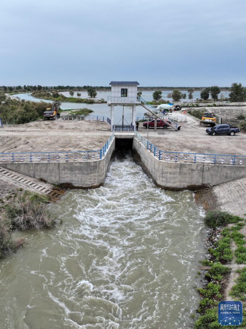 ↑在新疆阿克蘇地區(qū)沙雅縣蓋孜庫(kù)木鄉(xiāng),一處生態(tài)閘在進(jìn)行引洪灌溉胡楊林(8月4日攝,無(wú)人機(jī)照片)。