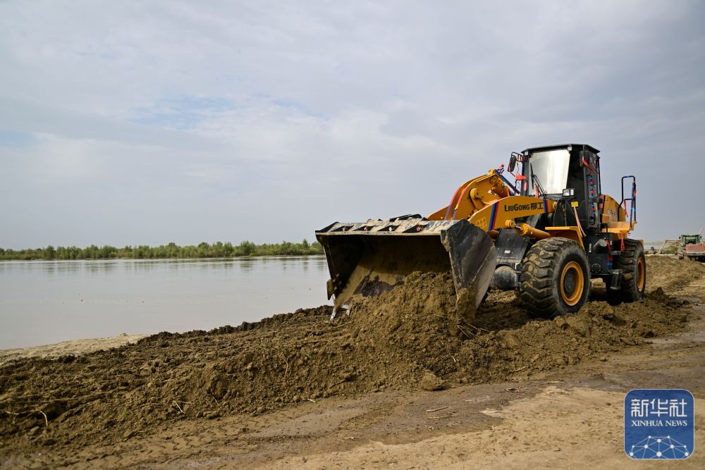 ↑在新疆阿克蘇地區(qū)沙雅縣蓋孜庫(kù)木鄉(xiāng)吐央村,搶險(xiǎn)人員駕駛大型機(jī)械進(jìn)行堤壩加固(8月3日攝)。