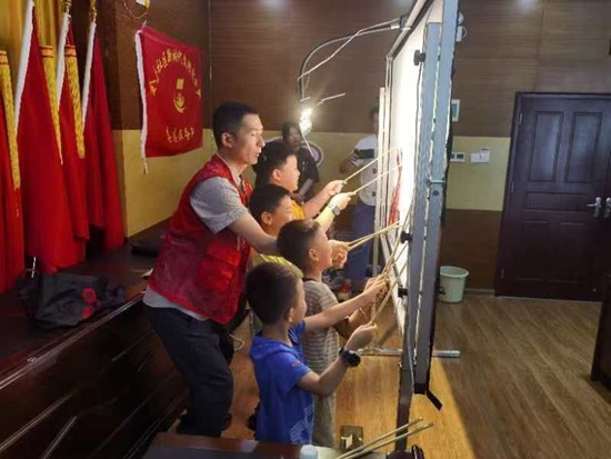 紙影戲(影偶制作技藝)非遺傳承人吳淵帶領(lǐng)小朋友體驗紙影戲。受訪者供圖
