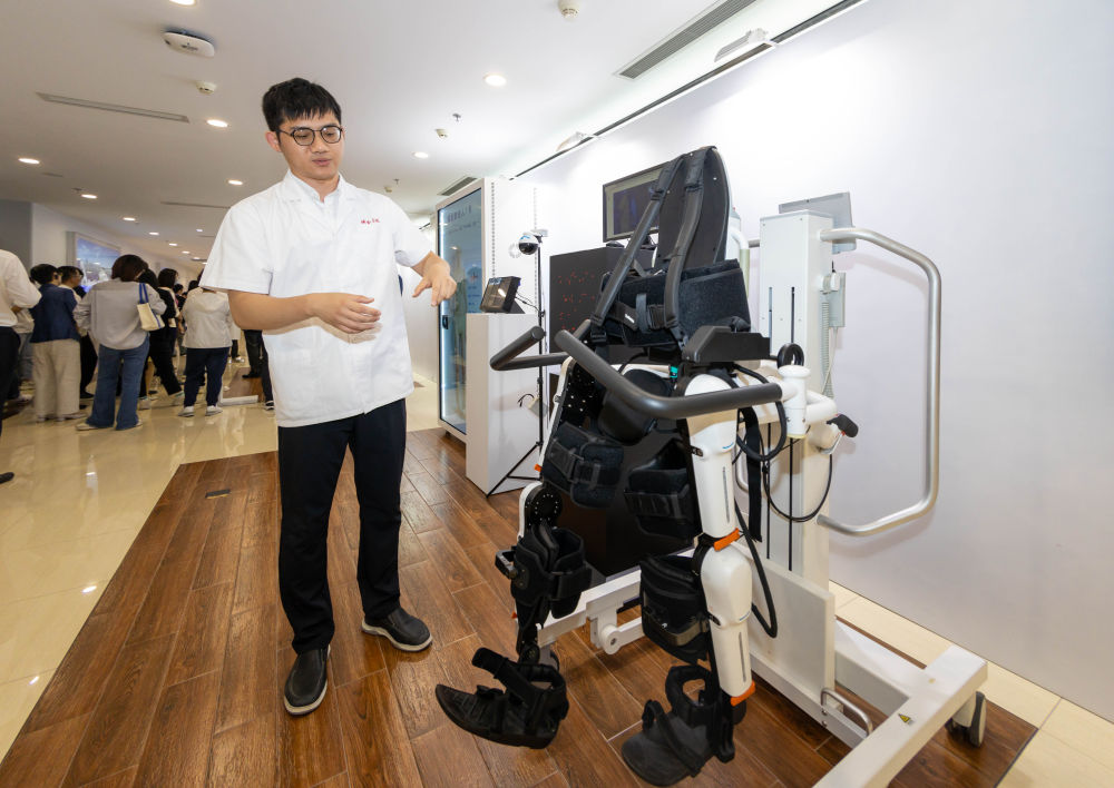 2024年5月24日,在位于上海市嘉定區(qū)的上海交通大學(xué)醫(yī)學(xué)院附屬瑞金醫(yī)院腫瘤質(zhì)子中心,工作人員介紹由瑞金醫(yī)院醫(yī)生和醫(yī)療公司共同研發(fā)的用于恢復(fù)患者下肢的醫(yī)療機(jī)器人。新華社記者 王翔 攝