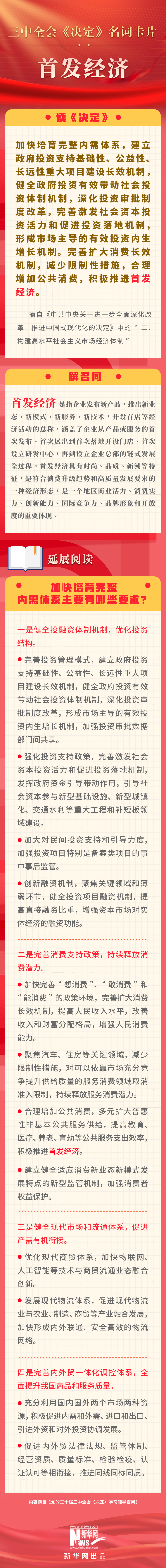 黨的二十屆三中全會(huì)審議通過了《中共中央關(guān)于進(jìn)一步全面深化改革、推進(jìn)中國式現(xiàn)代化的決定》。新華網(wǎng)依據(jù)《黨的二十屆三中全會(huì)〈決定〉學(xué)習(xí)輔導(dǎo)百問》,制作三中全會(huì)《決定》系列名詞卡片,和大家一起來深入學(xué)習(xí)領(lǐng)會(huì)二十屆三中全會(huì)精神。本期名詞是“首發(fā)經(jīng)濟(jì)”。