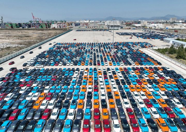 準備出口的上汽集團乘用車福建寧德基地生產(chǎn)的汽車??吭诟V莞劢幐蹍^(qū)海關(guān)監(jiān)管區(qū),等待裝船(2024年3月12日攝,無人機照片)。