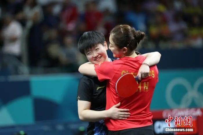 資料圖:巴黎奧運(yùn)女單決賽后,陳夢擁抱孫穎莎。中新社記者 盛佳鵬 攝