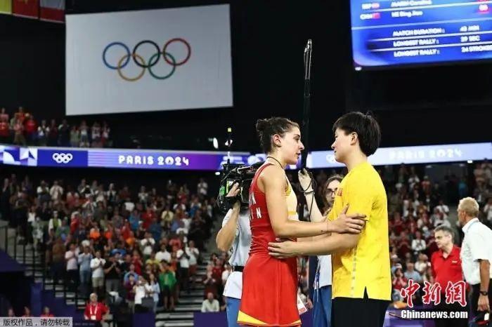 面對痛苦跪地、嚎啕大哭的馬林,何冰嬌主動(dòng)走上前,用一個(gè)溫暖的擁抱給予對手安慰與尊重,展現(xiàn)出中國運(yùn)動(dòng)員的風(fēng)度和胸襟。