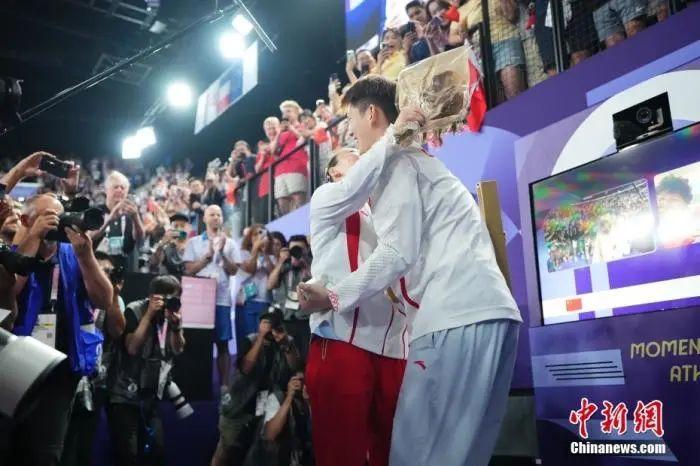 資料圖:北京時(shí)間8月6日,在巴黎奧運(yùn)會(huì)跳水女子10米臺(tái)決賽中,東京奧運(yùn)會(huì)該項(xiàng)目冠軍得主全紅嬋成功衛(wèi)冕,陳芋汐獲得亞軍。圖為全紅嬋和陳芋汐相擁。