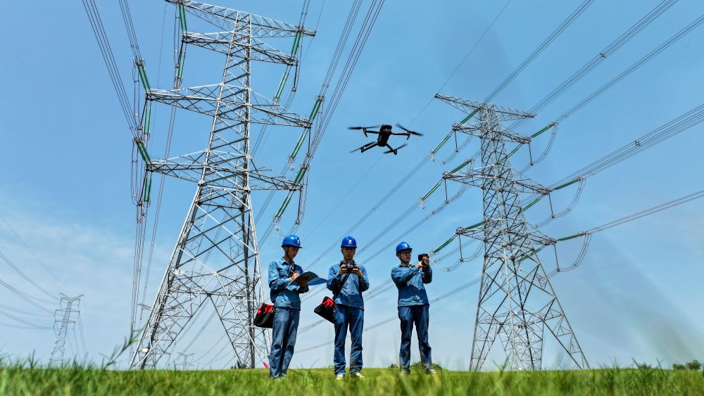 面對安徽、江蘇持續(xù)高溫,皖蘇兩省的電力工人聯(lián)合對省際聯(lián)絡線及相關(guān)配電設施進行檢修,并開展輸變電設施巡視檢查。這是在安徽省滁州市南譙區(qū),電力工人運用無人機對500千伏輸電線路進行巡視檢查(2024年8月9日攝)。新華社記者 曹力 攝
