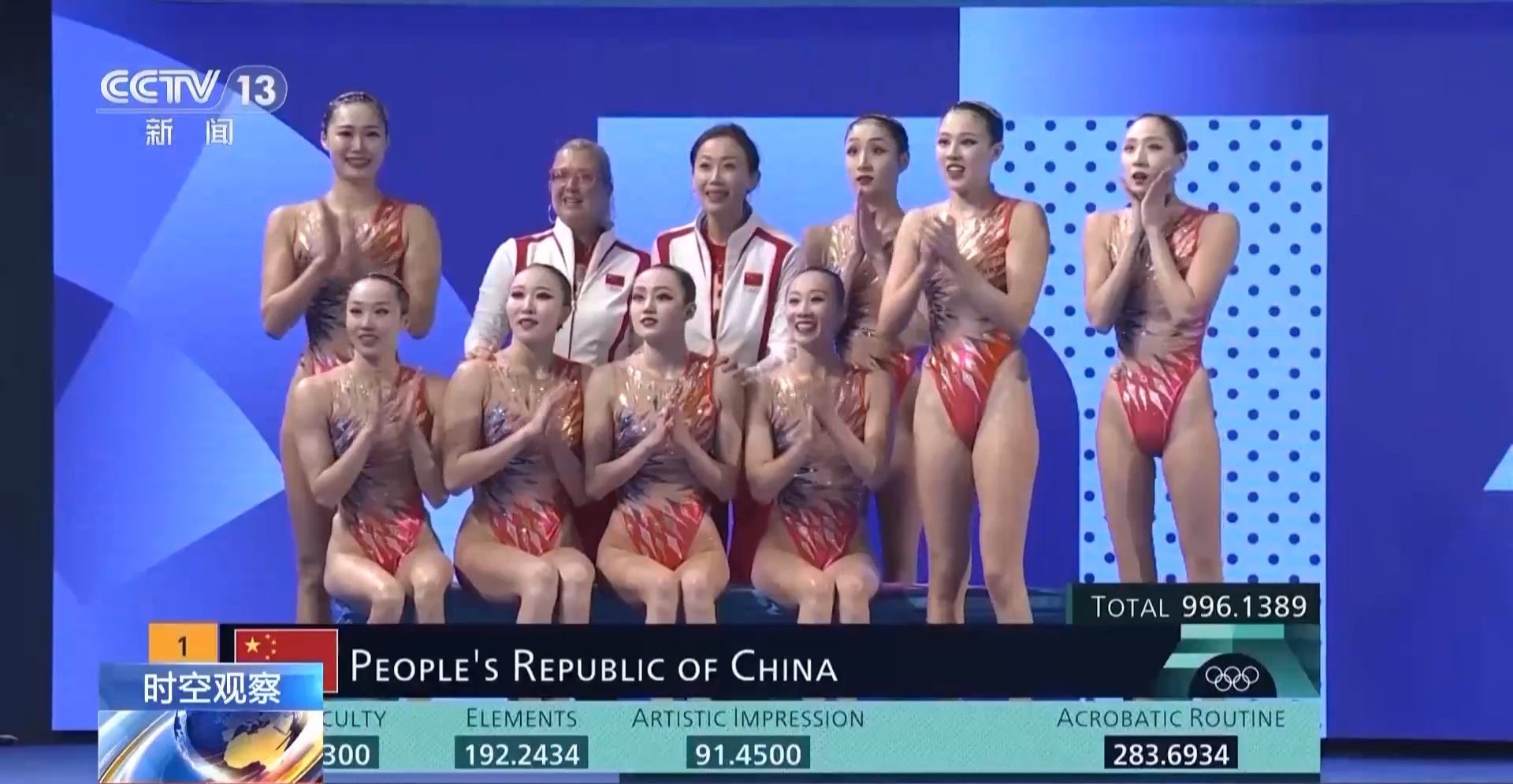 996.1389分!中國花游姑娘們以三場(chǎng)比賽穩(wěn)居第一的優(yōu)異表現(xiàn),贏得了中國花游在奧運(yùn)會(huì)上奪得的首枚金牌。