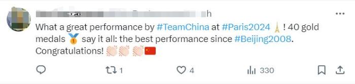 “中國隊(duì)在2024巴黎奧運(yùn)會(huì)上的表現(xiàn)太棒了!40枚金牌收官,這是自2008年北京奧運(yùn)會(huì)以來中國隊(duì)的最佳表現(xiàn)。恭喜!”