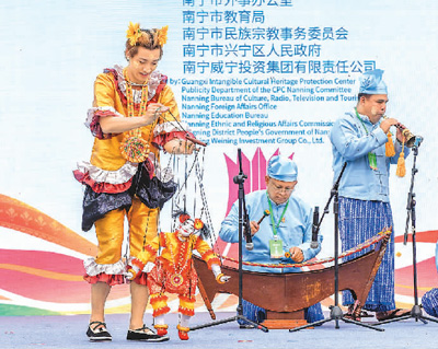四月十二日,在第二屆中國—東盟(南寧)非物質文化遺產周上,演員們進行非遺展演。彭寰攝(人民圖片)