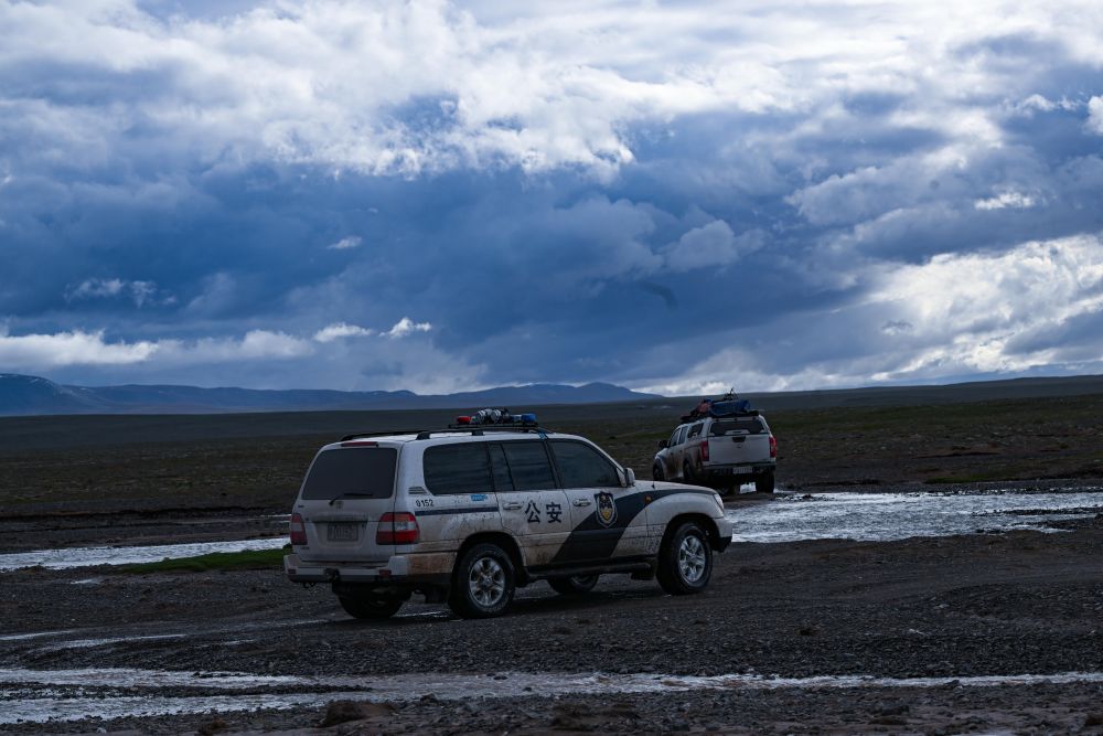 可可西里的夏季可謂一天見四季,十里不同天。初入無人區(qū)還是晴空萬里,走了十幾公里后車隊(duì)就被烏云籠罩,分不清是雨點(diǎn)還是冰雹,噼里啪啦地砸向車窗。
