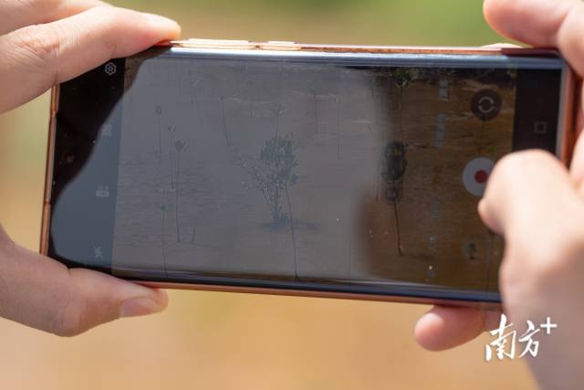 李明霖用手機(jī)拍下剛復(fù)種不久的“樹寶寶”。通過不同時(shí)間的影像對比,他們可以監(jiān)測紅樹林總體長勢。