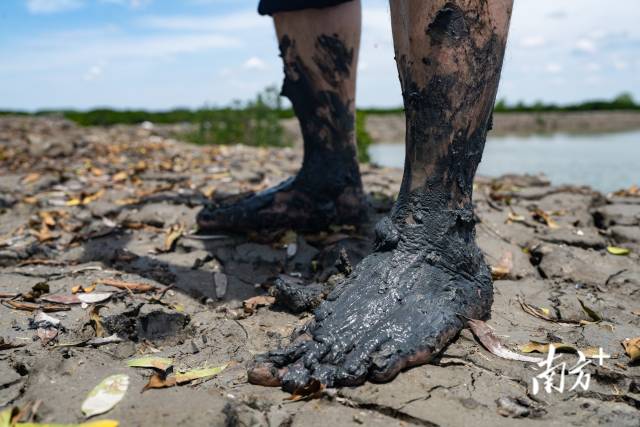1個(gè)多月過去,補(bǔ)種的“樹寶寶”該做“體檢”了。日頭漸猛,潮漲起來了。“脫鞋蹚過去!”聽著楊健宏的招呼,大家一腳踏進(jìn)泥地,一步一個(gè)腳印,泥土很快爬滿了小腿。