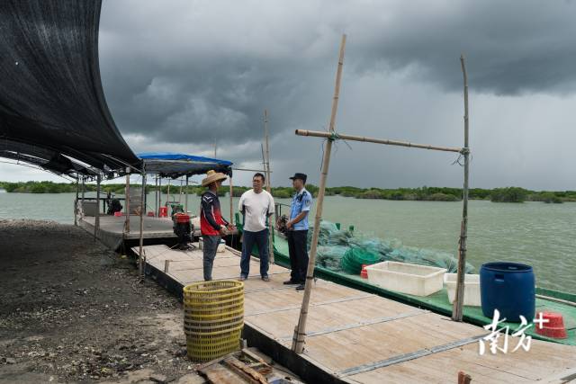 暴雨前夕,楊健宏正與保護(hù)區(qū)管理局工作人員向魚塘主科普紅樹林保護(hù)知識。