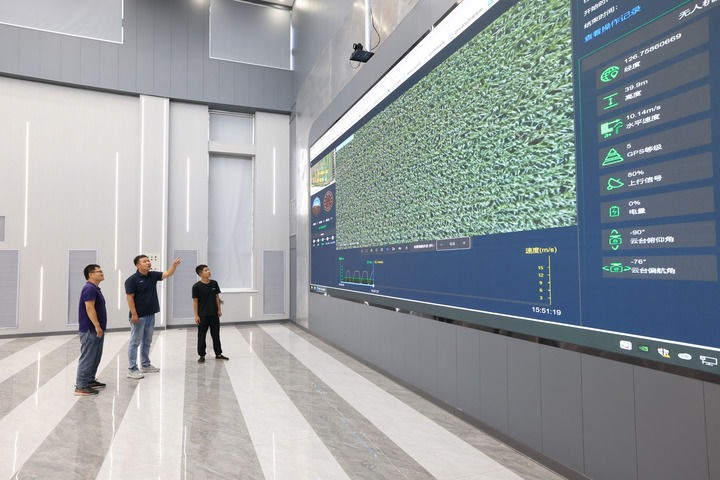 在黑龍江北大荒集團(tuán)趙光農(nóng)場(chǎng)有限公司科技服務(wù)中心,農(nóng)業(yè)科技人員通過(guò)田間物聯(lián)網(wǎng)系統(tǒng)在數(shù)字農(nóng)業(yè)指揮大廳實(shí)時(shí)觀看智能無(wú)人機(jī)回傳的視頻,及時(shí)查看田間作物長(zhǎng)勢(shì)情況(2024年7月22日攝)。新華社發(fā)(錢(qián)泊羽攝)