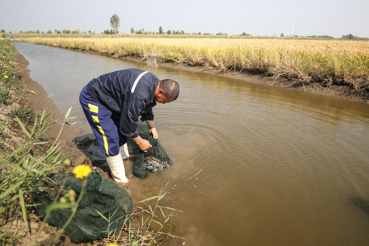 工作人員在遼寧盤(pán)錦市大洼區(qū)三角洲“蟹稻+”綜合種養(yǎng)模式試驗(yàn)基地的稻田收獲河蟹(2022年9月28日攝)。新華社記者 潘昱龍 攝