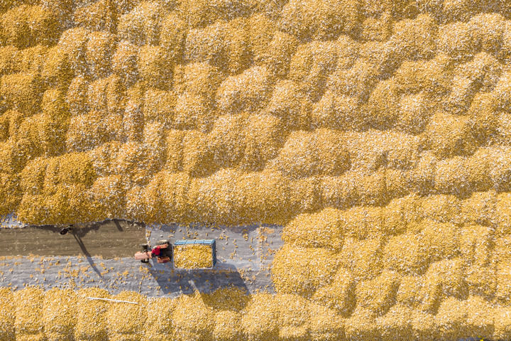 在黑龍江省肇東市五里明鎮(zhèn)東升村,農(nóng)民把收獲的玉米運(yùn)到當(dāng)?shù)剞r(nóng)業(yè)合作社指定的地點(diǎn)進(jìn)行晾曬(2023年10月19日攝,無(wú)人機(jī)照片)。新華社記者 謝劍飛 攝