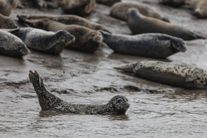 西太平洋斑海豹在遼寧盤(pán)錦三道溝海域的灘涂上休息(2024年4月9日攝)。新華社記者 潘昱龍 攝