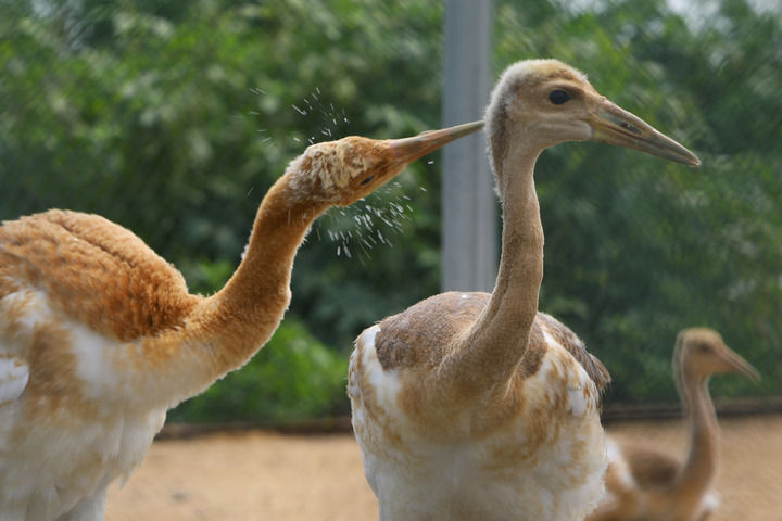 丹頂鶴雛鳥(niǎo)在遼寧盤(pán)錦市林業(yè)和濕地保護(hù)服務(wù)中心鶴類(lèi)繁育保護(hù)站內(nèi)嬉戲(2023年8月3日攝)。新華社記者 陳為 攝