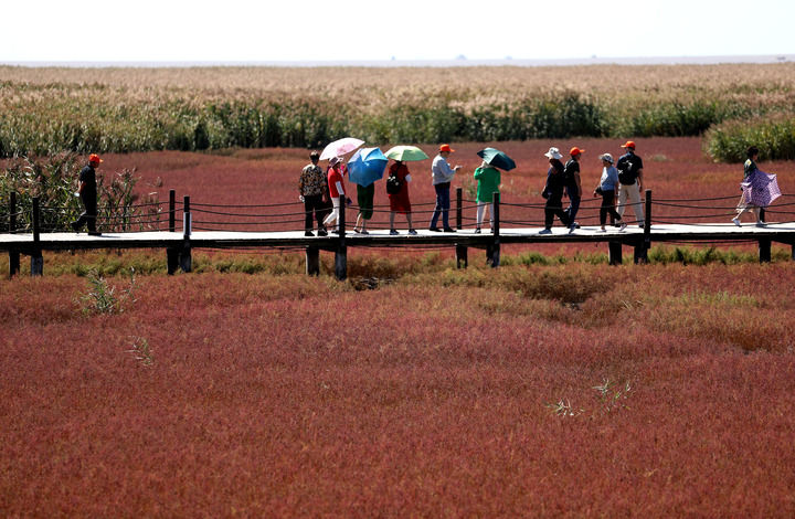 游客在遼寧盤(pán)錦紅海灘國(guó)家風(fēng)景廊道景區(qū)游覽(2023年9月12日攝)。新華社記者 姚劍鋒 攝