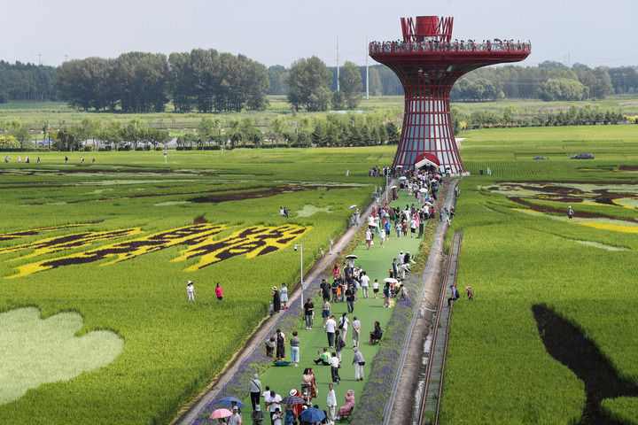 時(shí)值暑假,盤(pán)錦紅海灘國(guó)家風(fēng)景廊道游客如織。登上觀景臺(tái),向南望去是成片的紅海灘,轉(zhuǎn)身再看,一幅巨大的稻田畫(huà)在風(fēng)中搖曳,令人心曠神怡。