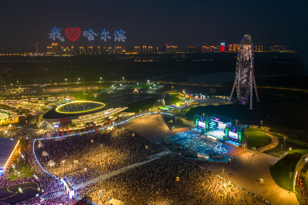 人們在哈爾濱國際啤酒節(jié)現場觀看無人機表演。新華社記者 張濤 攝