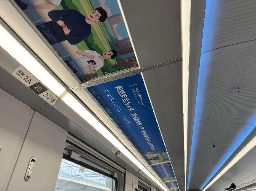 據(jù)介紹,專列的8個主題車廂分別以“中國網(wǎng)絡(luò)法治三十年”“網(wǎng)絡(luò)安全”“數(shù)據(jù)安全”“未成年人網(wǎng)絡(luò)保護”“數(shù)據(jù)出境之旅”“反網(wǎng)暴凈網(wǎng)行動”“個人信息守護”以及“網(wǎng)絡(luò)空間命運共同體”命名,通過鏡框海報、玻璃貼、小桌板貼、行李架彩貼、頭枕片、車內(nèi)LED信息屏等形式多樣的載體,全面展示網(wǎng)絡(luò)法治30年成就、網(wǎng)絡(luò)空間命運共同體主張。讓乘客們在享受舒適旅途的同時,也能輕松學習到實用的法律信息。