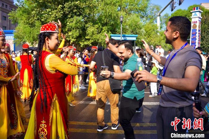 22日,民族風情街上,巴基斯坦媒體人與當地維吾爾族居民一起跳起維吾爾族舞蹈。陳欣怡 攝