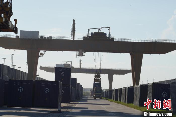圖為龍門吊正將集裝箱從卡車轉(zhuǎn)移至中越班列。王以照 攝