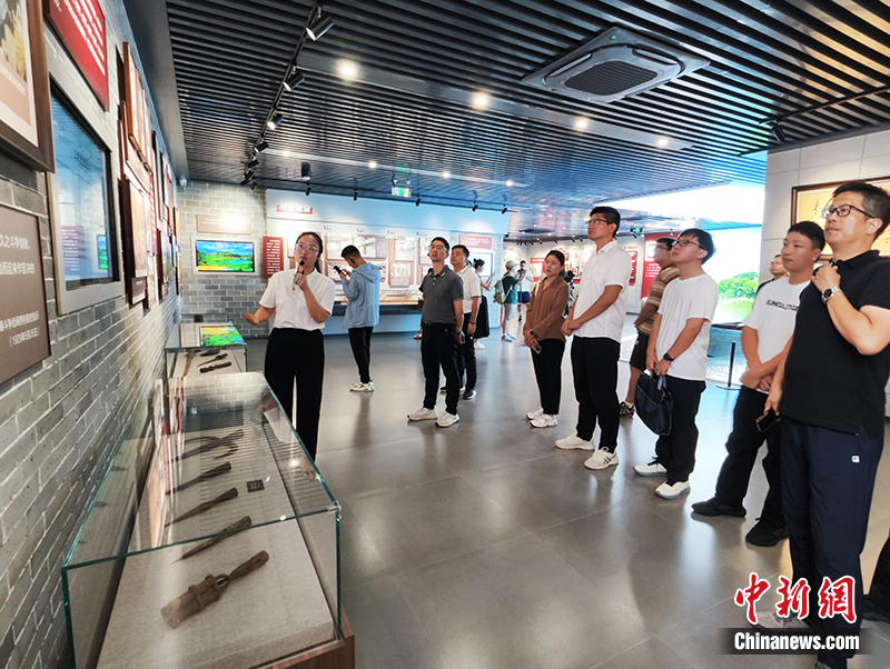 “紅旗躍過汀江”文創(chuàng)服務(wù)中心內(nèi),講解員向采訪團(tuán)成員講解歷史故事。劉越 攝