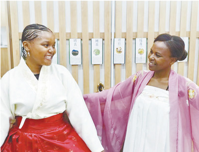 當地時間4月20日,為慶祝第十五個聯合國中文日,南非德班理工大學孔子學院舉辦以“說文解字,以茶會友”為主題的活動?;顒訁⑴c者身穿中國傳統(tǒng)服飾,共同探討漢字和茶文化。圖為兩名當地女孩試穿中國傳統(tǒng)服飾。