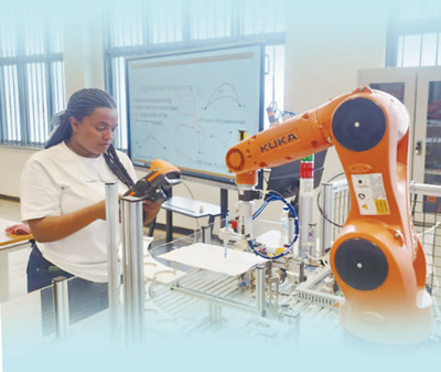 埃塞俄比亞魯班工坊由天津職業(yè)技術師范大學與埃塞聯邦職業(yè)技術培訓學院合作建立,于2021年4月揭牌啟運,聚焦人工智能領域,對接當地合作院校的電氣自動化與控制技術管理等專業(yè)。圖為當地學生在操作工業(yè)機器人。