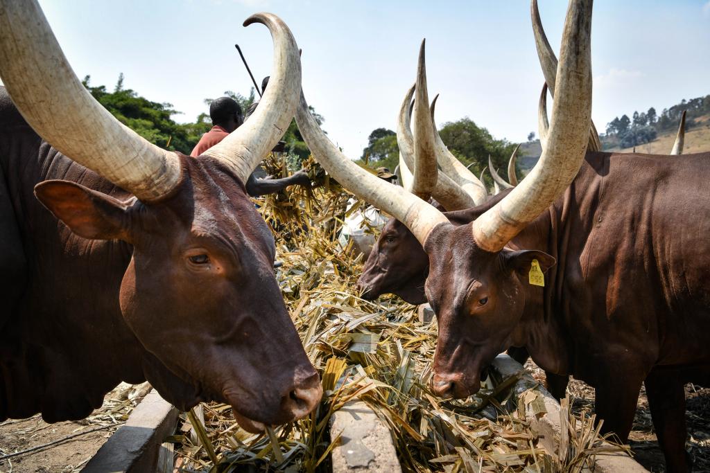 8月14日,在盧旺達南方省的一處牧場,牲畜食用菌草飼料。